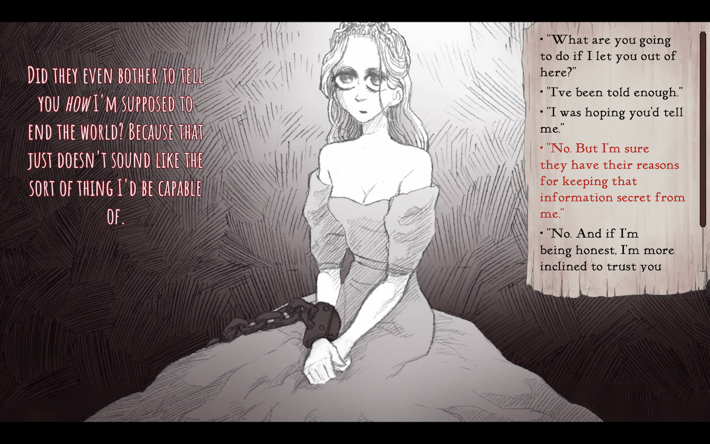 Slay the Princess, a cheeky horror tragicomedy. In this fully-voiced roleplaying game, the player is tasked by a mysterious voice to kill a princess who has been imprisoned in a cabin hidden deep in the woods. If the player doesn’t fulfill their task, the voice alleges, the princess will bring about the end of the world. But can the voice be trusted? Can the Princess be trusted? Can anyone be trusted?