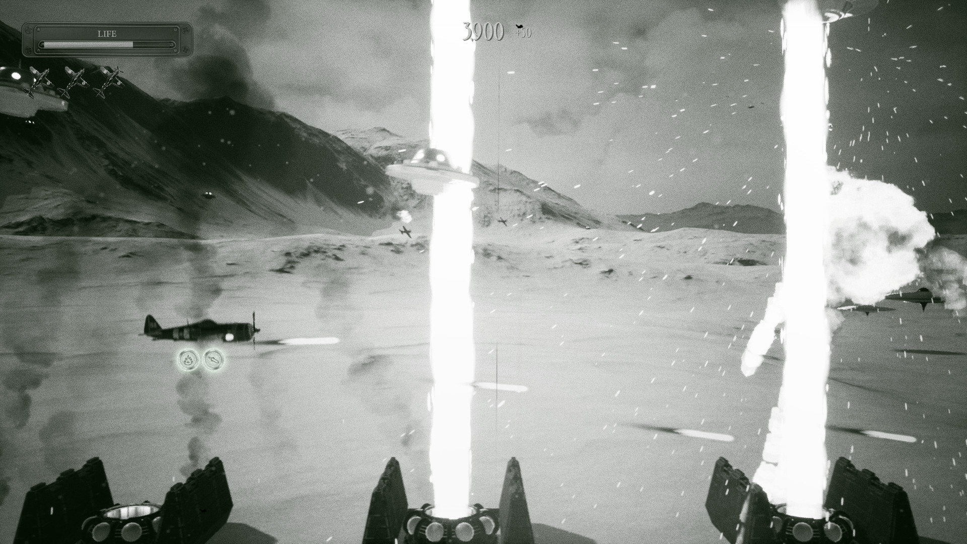 - Cinematic experience – Glorious black-and-white aesthetics, live-action FMV sequences and dubbed voices will tell the story of the battle between the squadron and Director Zarog’s alien supremacy.
