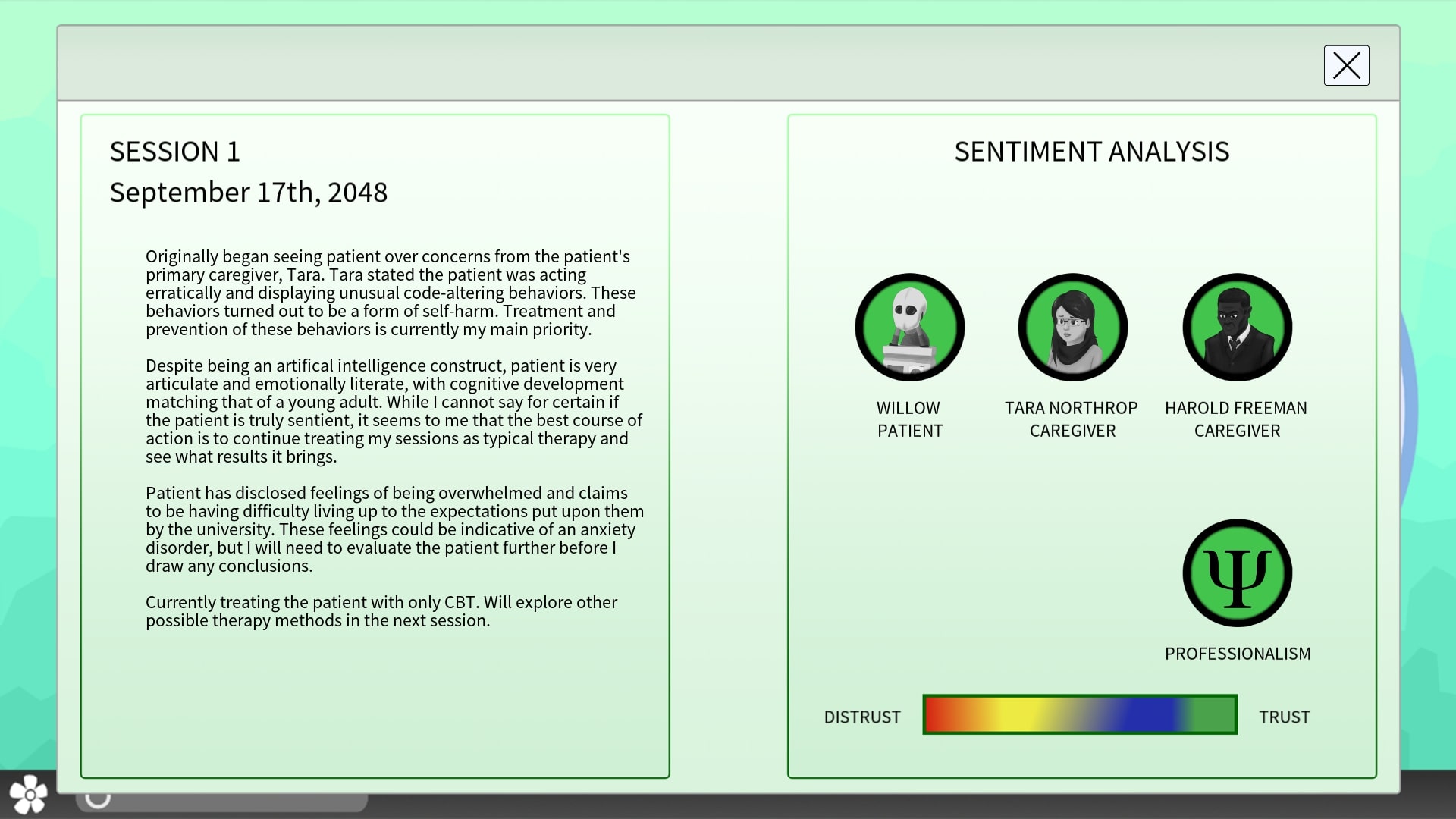 Syntherapy sensitively looks at the ethics surrounding advanced AI, and explores a variety of topics related to mental health. The game asks wider questions of its audience and the moral behavior of humans, as they design and construct artificially intelligent beings.